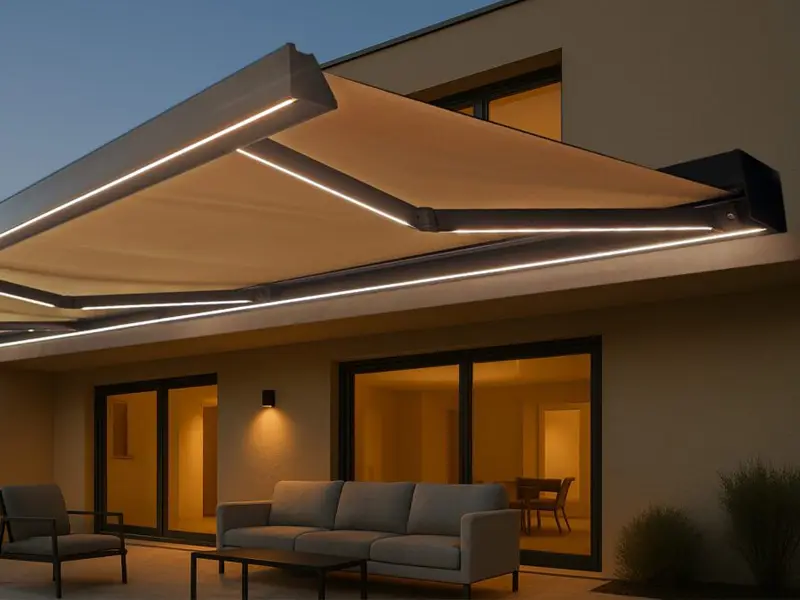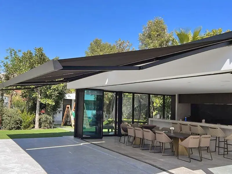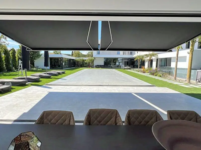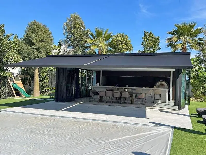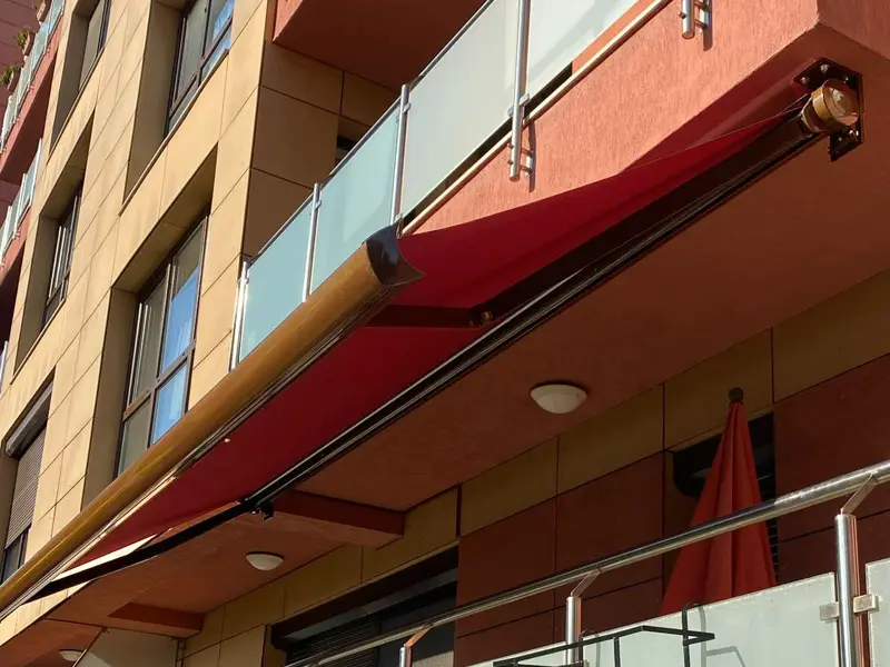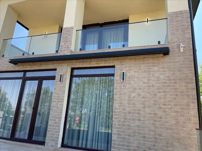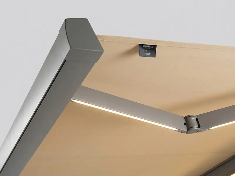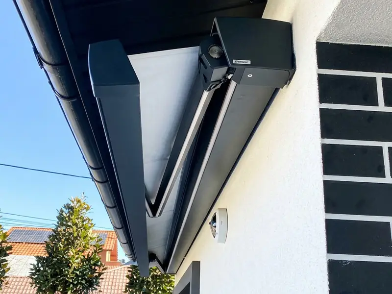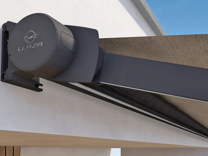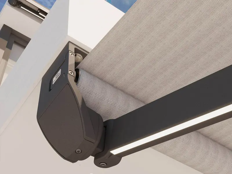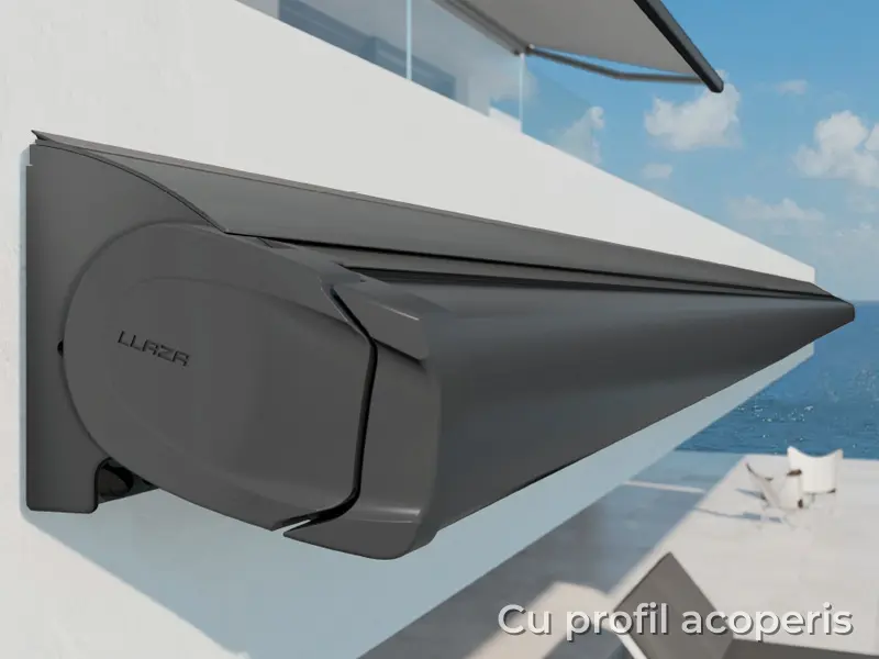 Profilul frontal plat se cuplează perfect cu caseta la retragere completă — aspectul e îngrijit din orice unghi. Opțiunea Sombrex adaugă o perdea frontală care coboară din profilul frontal: protecție solară și când soarele e jos la orizont (dimineața devreme sau seara), plus intimitate față de vecini. Sombrex-ul are acționare independentă față de copertină — poate fi folosit și separat.