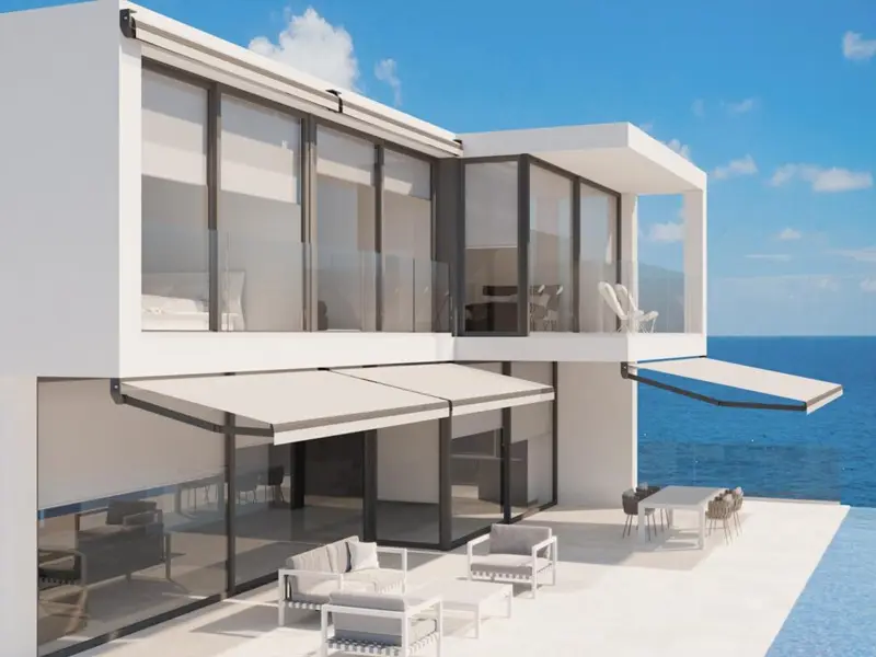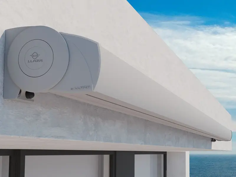 Design cu linii soft cu protecție totală — pânza și brațele sunt complet înglobate în casetă, nimic nu iese în exterior când copertina e retrasă. Disponibil cu stor frontal Sombrex. Alegerea preferată pentru cei care pun accent pe estetică minimalistă.