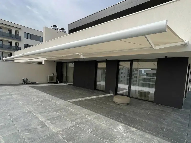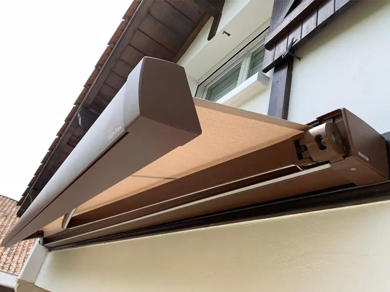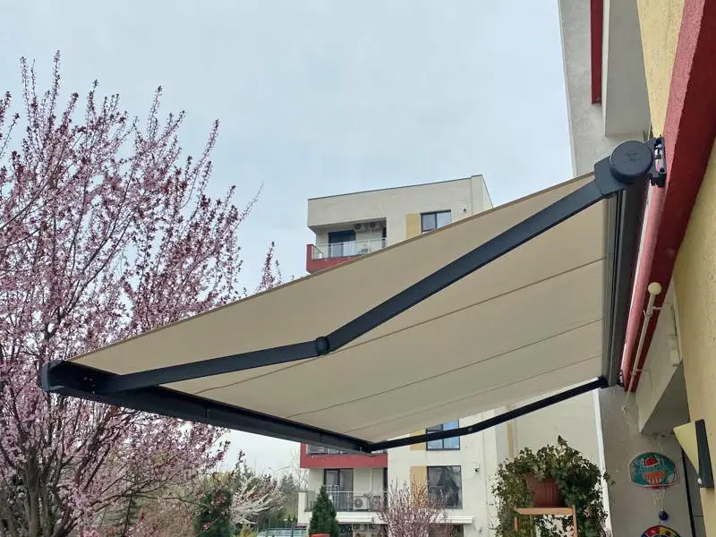 Copertina clasică necasetată — tubul de rulare și brațele rămân vizibile când e retrasă, estetică tradițională compatibilă cu orice stil de fațadă. Aceleași materiale, aceeași durabilitate ca la modelele casetate — fără compromisuri.