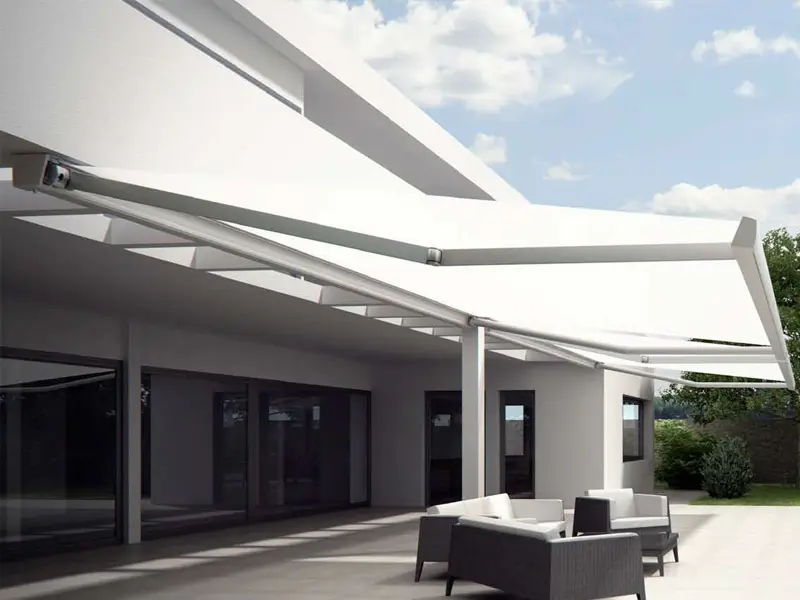 Forma dreptunghiulară se integrează în arhitectura contemporană ca și cum ar fi fost proiectată odată cu clădirea. Singurul model din gamă cu montaj exclusiv frontal. Capace laterale din aluminiu masiv. Disponibil cu până la 4 brațe pentru terase și spații comerciale mari.