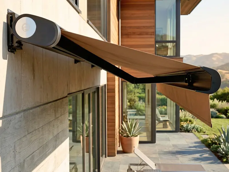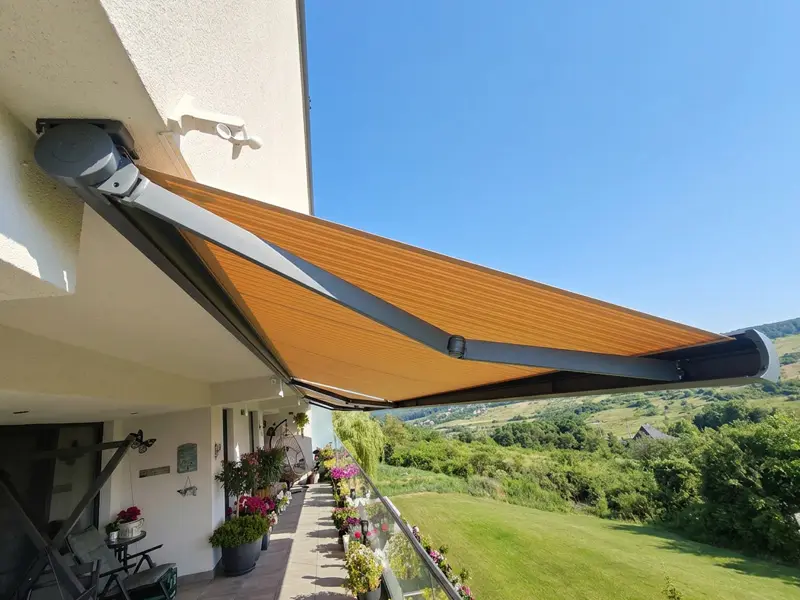 Deși e conceput pentru spații mai compacte, acoperă 6 metri în lungime fără suport intermediar — avantaj real pe terase lungi și înguste. Unghiul de 75° depășește toate modelele din categoria 400, util când soarele e jos la orizont dimineața sau seara.