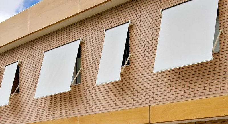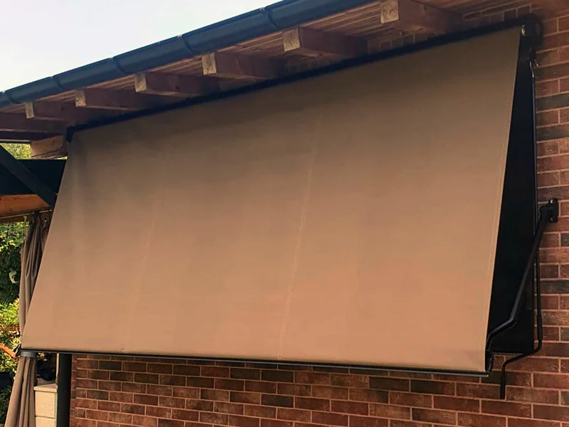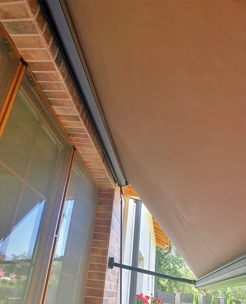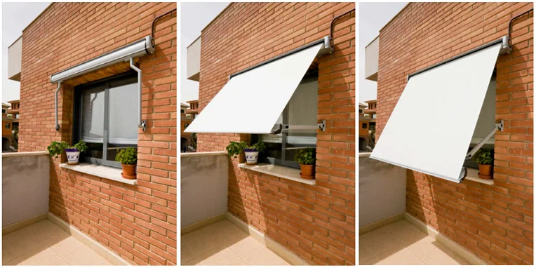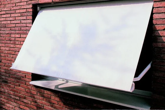 Pânza se derulează vertical, urmând planul geamului. La capătul inferior, două brațe laterale cu arcuri (PRT — Pressure Resistance Tension) împing bara frontală în afara peretelui, la un unghi care poate varia între 0° și ~130°. Rezultatul: o pânză aproape verticală la unghi mic (protecție la soarele jos de dimineață/seară) sau o pânză înclinată spre exterior la unghi mare (protecție la soarele înalt de prânz, ventilație sub pânză).