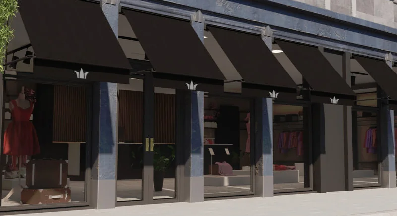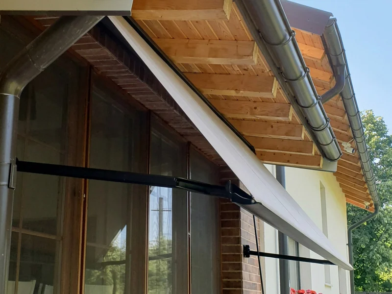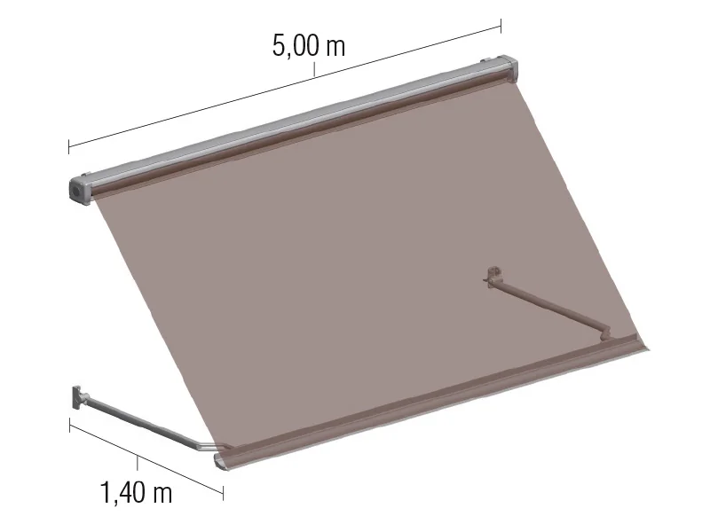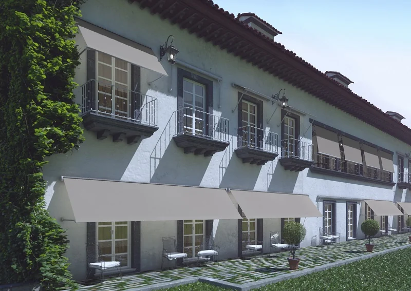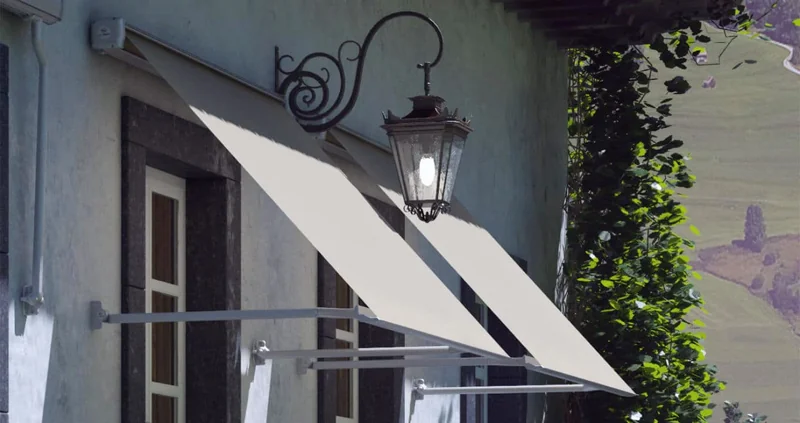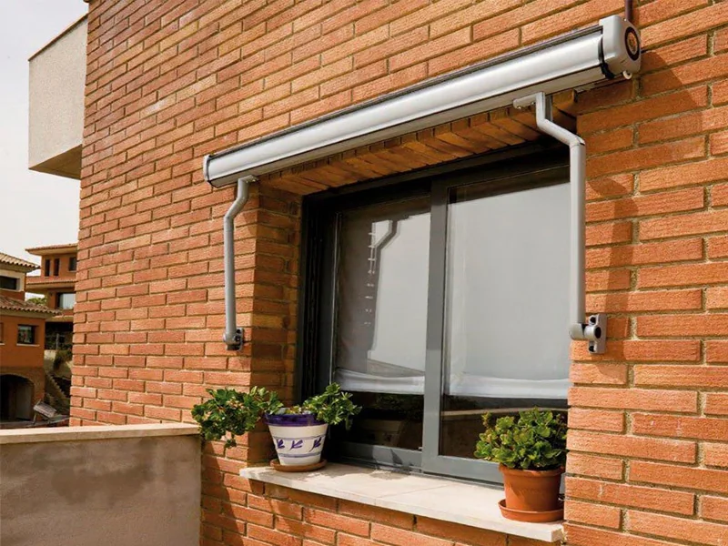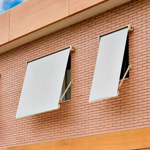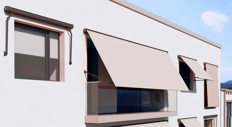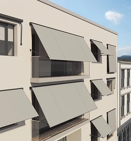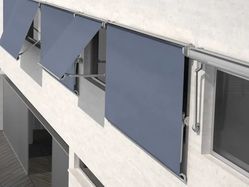 Copertină verticală pentru ferestre și fațade, cu brațe laterale cu arcuri care împing marginea inferioară a pânzei în afara peretelui, la un unghi reglabil. Sistem diferit de copertinele clasice de terasă: aici pânza coboară vertical de-a lungul geamului, iar brațele laterale o țin distanțată de fațadă — exact atât cât e nevoie pentru a bloca radiația solară directă pe sticlă, fără a obstrucționa lumina ambientală și fără a ocupa spațiul de pe balcon sau trotuar. Casetă de aluminiu auto-protejată, profil foarte discret (132 × 126 mm), material textil Recacril cu peste 250 de culori și modele, durată de viață 15–20 ani.